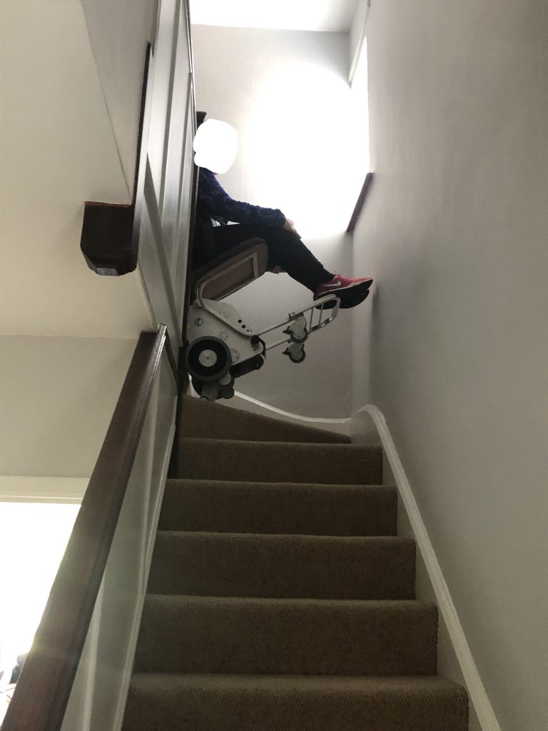 They visited with two models – one with an integral seat and one which a wheelchair would be used. As we were keen to source something which was a compact as possible we opted to trial the model with the integral seat. This worked really well on the stairs, even overcoming the fan turn at the top.