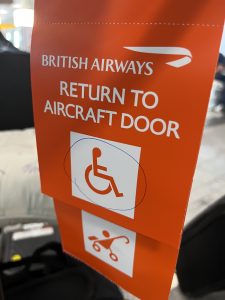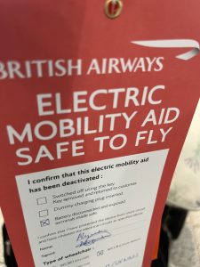 At check-in all the details were already loaded into the airline computer system, and these were just confirmed by check in staff and a labels attached to the scooter – see photo’s below.  These confirmed that the scooter was safe to fly (we were advised that we would need to remove the battery and take it into the aircraft cabin with us); and a note to ground crew to return the scooter to the aircraft door on landing so it can be used through security etc on arrival at our destination.