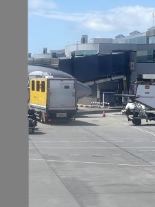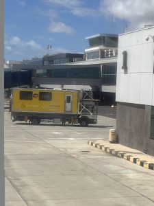 At Tenerife, there were a lot of other wheelchair users on the flight, and therefore they used an Ambulift – which was like a large portacabin which raised up to the level of the aircraft, and then lowered to ground level, and then drove us to security.  See photographs of the Ambulift (attached to a different aircraft & driving around the airport in Tenerife).  There was a huge bonus on arrival at Tenerife as this airport is renown for long queues at security – however all wheelchair users were taken to the front of the security queue which saved us lots of time.  Once through the airport we were also shown a different place to pick up a taxi – separate from the long queue and were picked up almost instantly.  So it was definitely a good move to travel with the scooter rather than hire one at our destination.  Coming home from Tenerife they were just as efficient, and used a similar process to the one at Gatwick airport; giving us priority security queue which again saved a very long queue